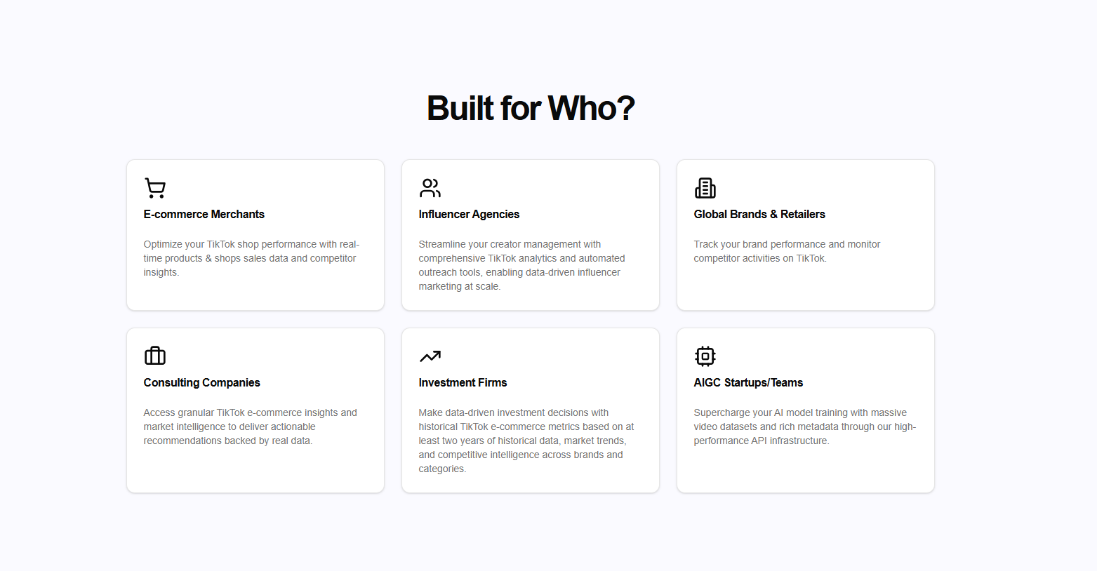 Tabcut mirrors over 90% of TikTok Shop’s market data, earning official recognition from TikTok staff. Its intelligent analysis and live stream monitoring tools are a hit among sellers. Key offerings: