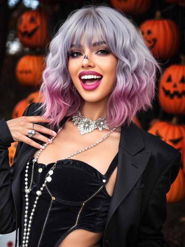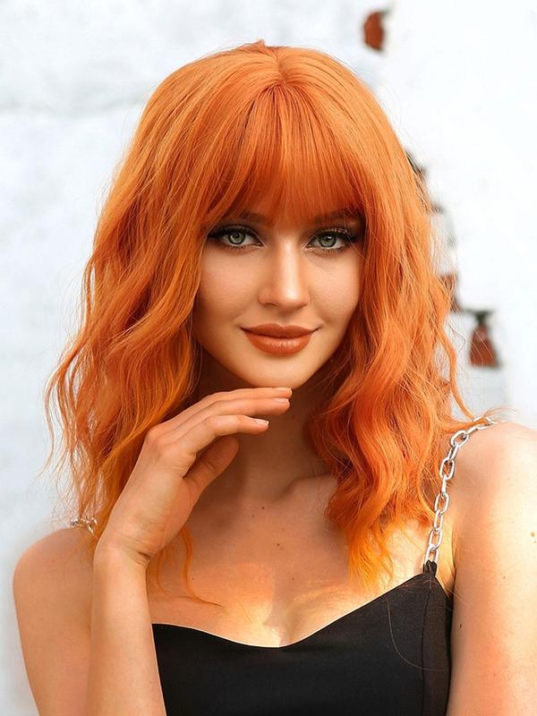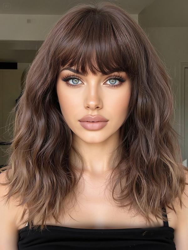 Women's 16 Inch Long Curly Wigs with Bangs, Heat Resistant Natural Looking Synthetic Wigs for Party, Daily Use