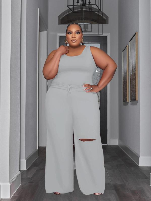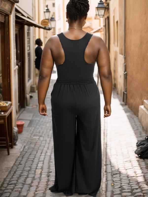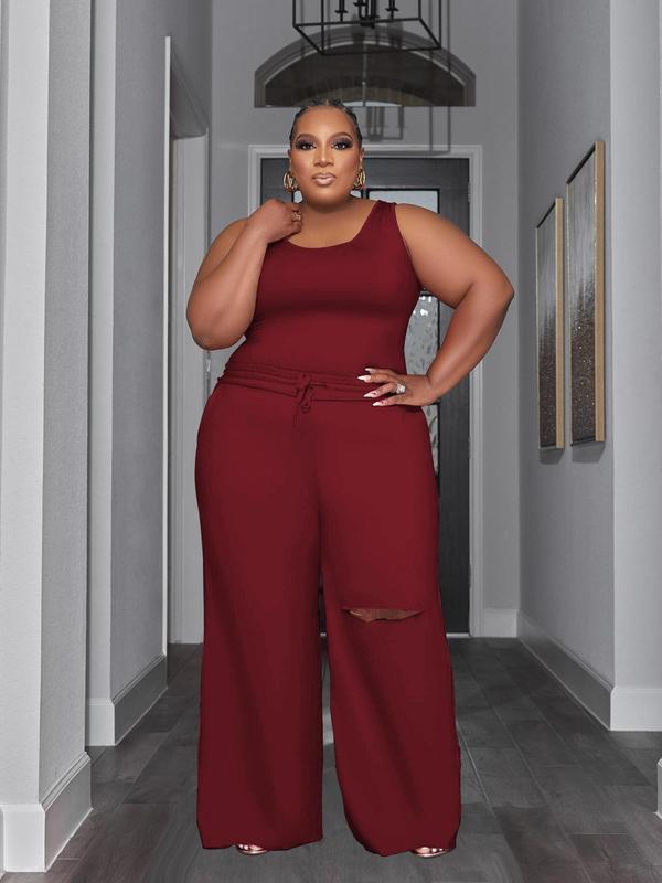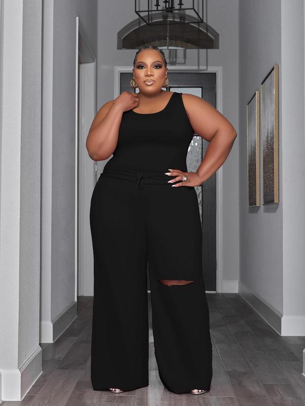 Plus Size Solid Tank Top & Elastic Waist Cut Out Wide Leg Pants Set, Casual Minimalist Scoop Neck Sleeveless Top & Drawstring Waist Trousers, Women's Two-piece Outfits for Summer, Womenswear, Casual Matching Set, Clothes